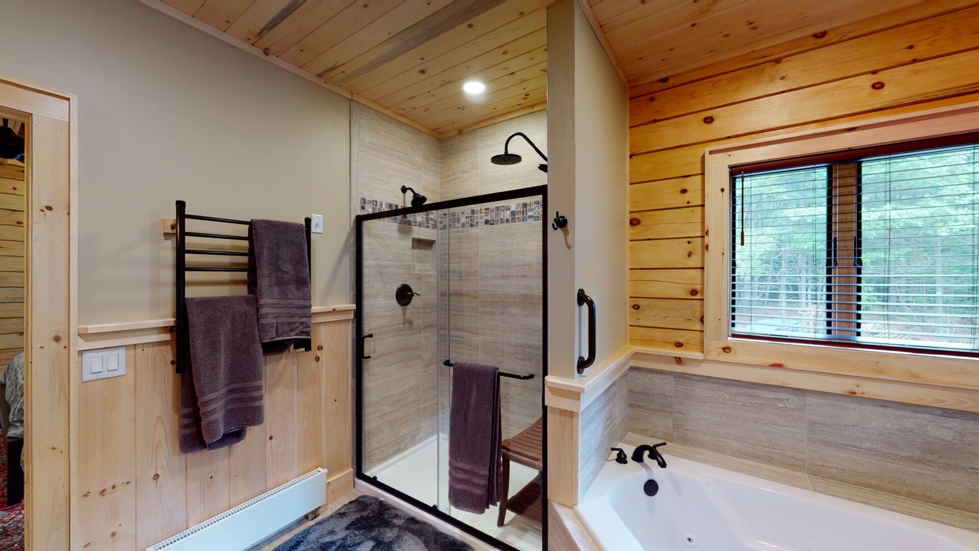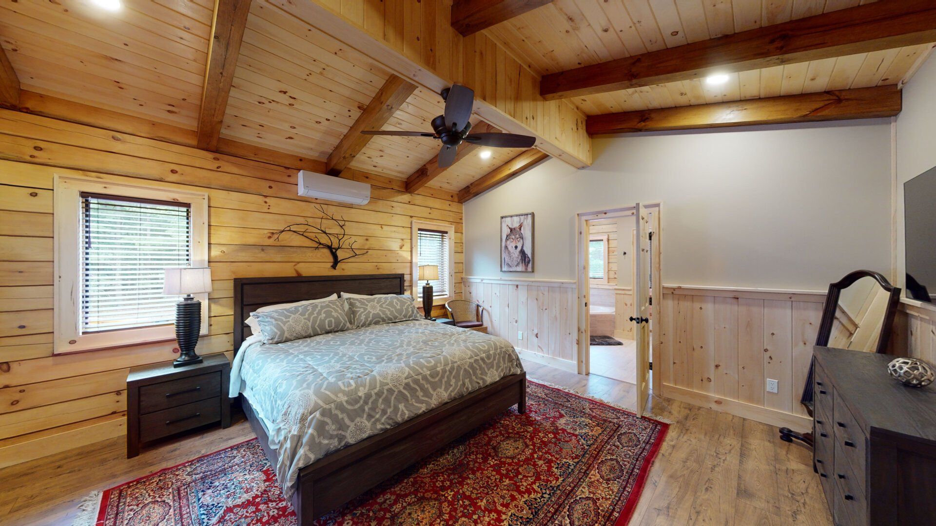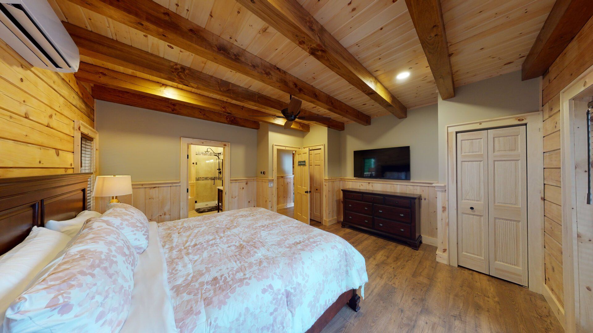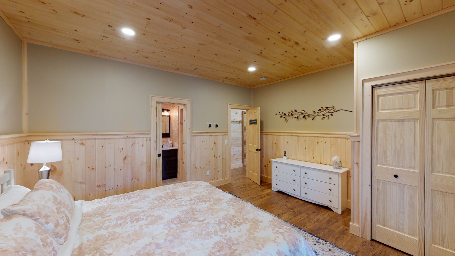 - Bedroom #1 "Lower Wilderness" with King Bed. En-suite bath has a walk-in shower and a heated towel rack