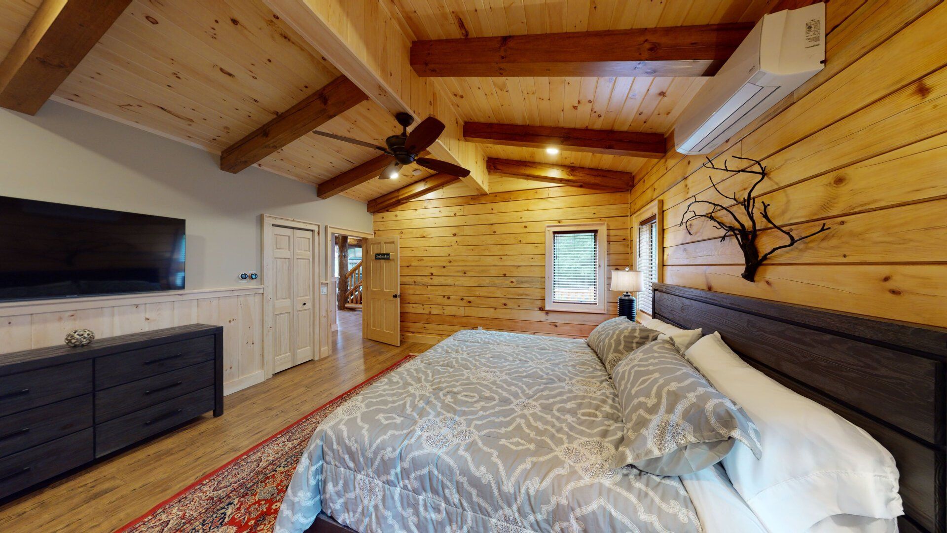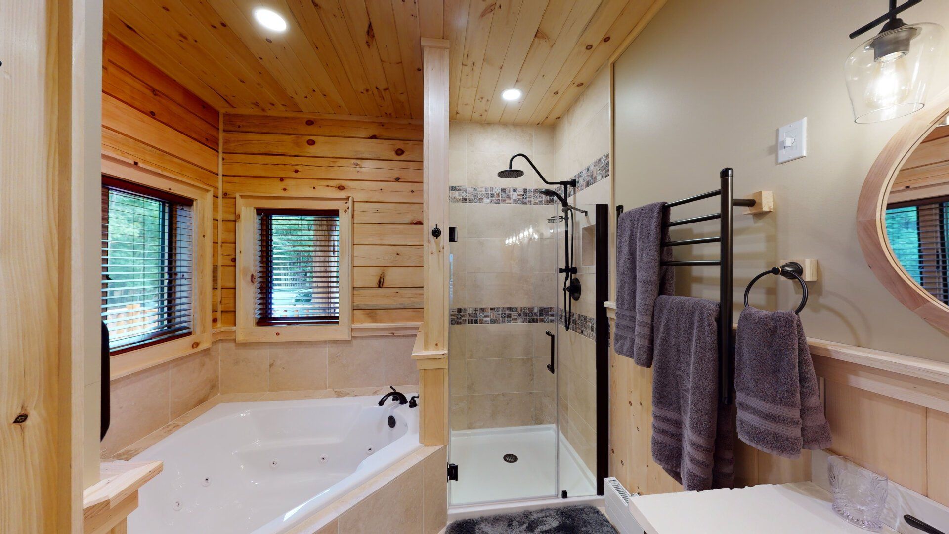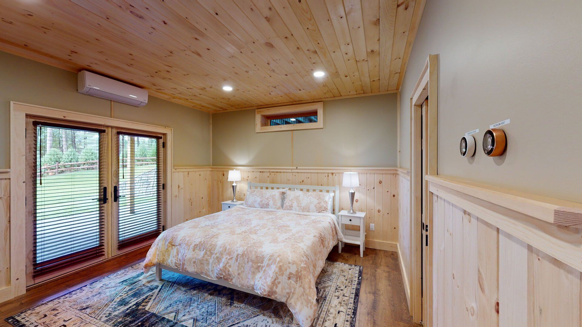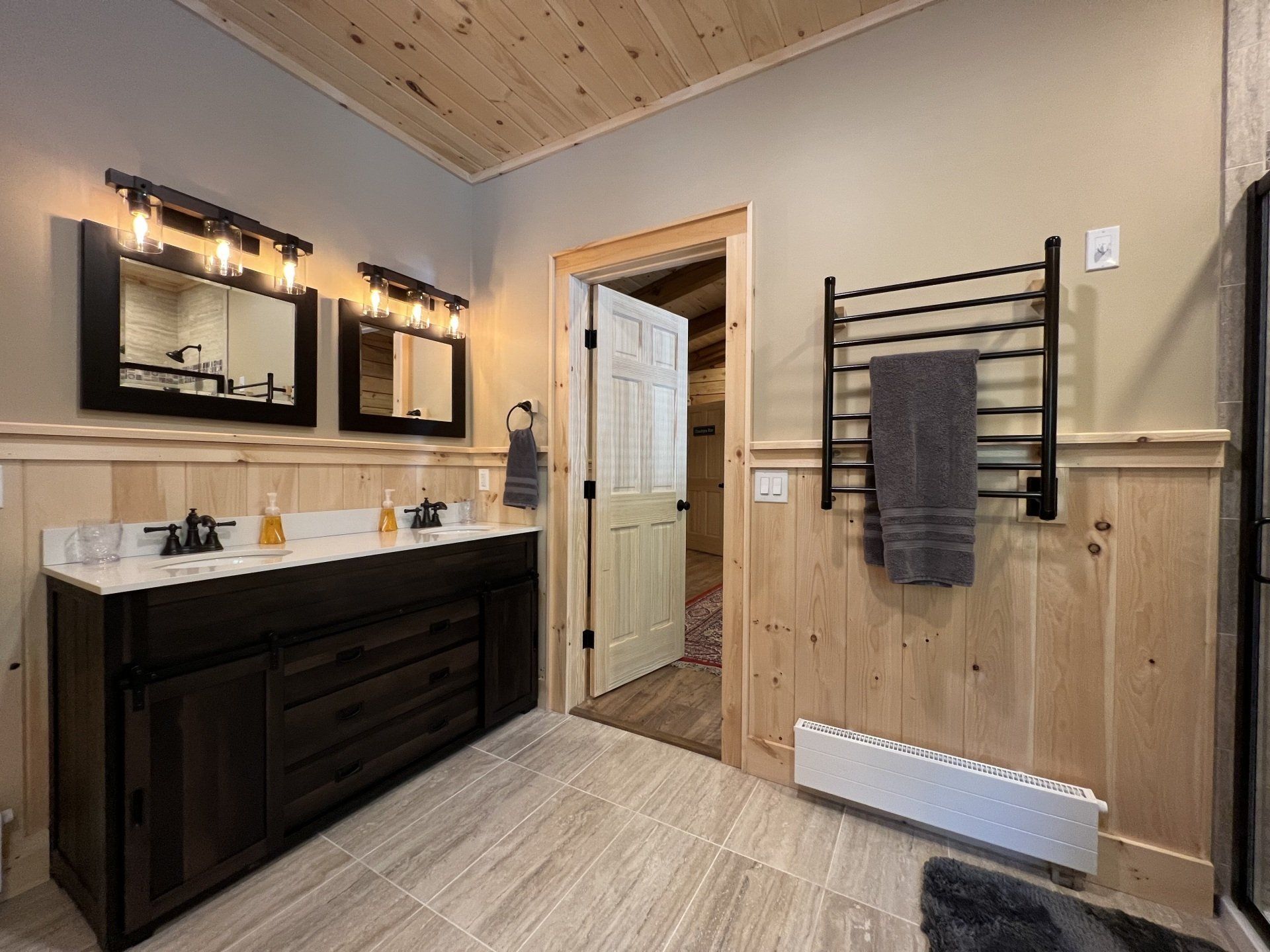 - Bedroom #1 "Lower Wilderness" with King Bed. En-suite bath has a walk-in shower and a heated towel rack